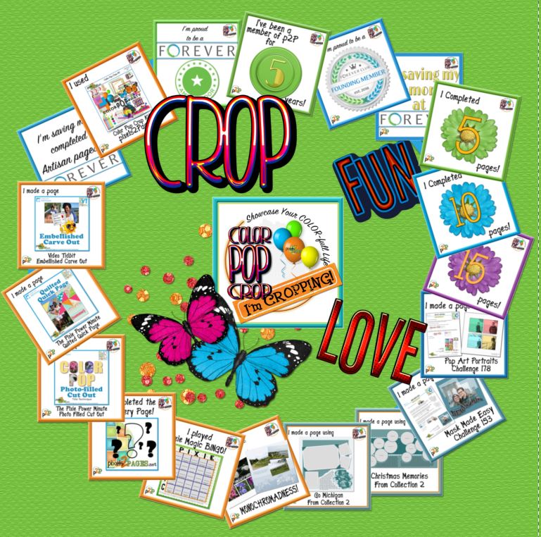 But when he asked, I paused and thought about it. I then told him: get a bingo, earn 20 badges, and finish pages for our 2017 Denver Trip. Context: I’m a member of the pixels2Pages group. They offer all sorts of trainings and digital goodies for their members and every quarter offer a digital crop. The digital crop is the membership in hyper-drive. They offer challenges with detailed instructions, games, how-to-videos and a community of support. This crop one of the games was a bingo card – if you filled up a row or a column by doing pages with certain techniques and then posted it on their facebook group, you’d be entered in a drawing. Every crop they have specific badges – for certain numbers of pages done, how long you’ve been a member, if you’re new, completing some of the challenges, etc.